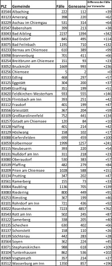 Bei der berichteten Verteilung der Fälle auf die Gemeinden kann es durch festgestellte Ausbrüche z.B. in Pflegeeinrichtung zu einer deutlich höheren Fallzahl kommen als in umliegenden Gemeinden. Im Rahmen von Reihenuntersuchungen werden hier Fälle entdeckt, die in anderen Gebieten nicht entdeckt wurden, so dass die Fallzahlen kein Abbild der Erkrankungen in der Bevölkerung darstellen. Hierbei werden auch Personen positiv getestet, die einen Verlauf ohne Symptome zeigen. Zusätzlich kann das Testverhalten zu regionalen Unterschieden führen. Deshalb kann man im Moment keine Rückschlüsse auf eine höhere oder niedrigere Gefahr in den unterschiedlichen Gemeinden ziehen. Aufgrund von Aktualisierungen kann es zu Veränderungen kommen.
