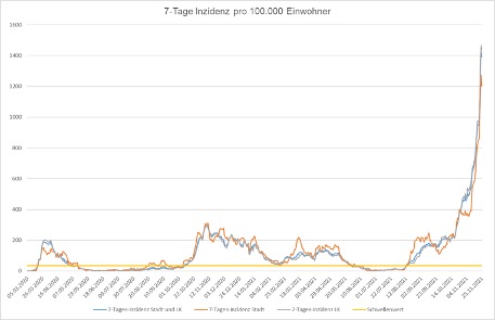 Am 24.11. wurde der vorläufige traurige Höchststand der 7-Tage-Inzidenz erreicht: Im Landkreis mit einer 7 – Tage Inzidenz von 1438 und 1273 in der Stadt Rosenheim.