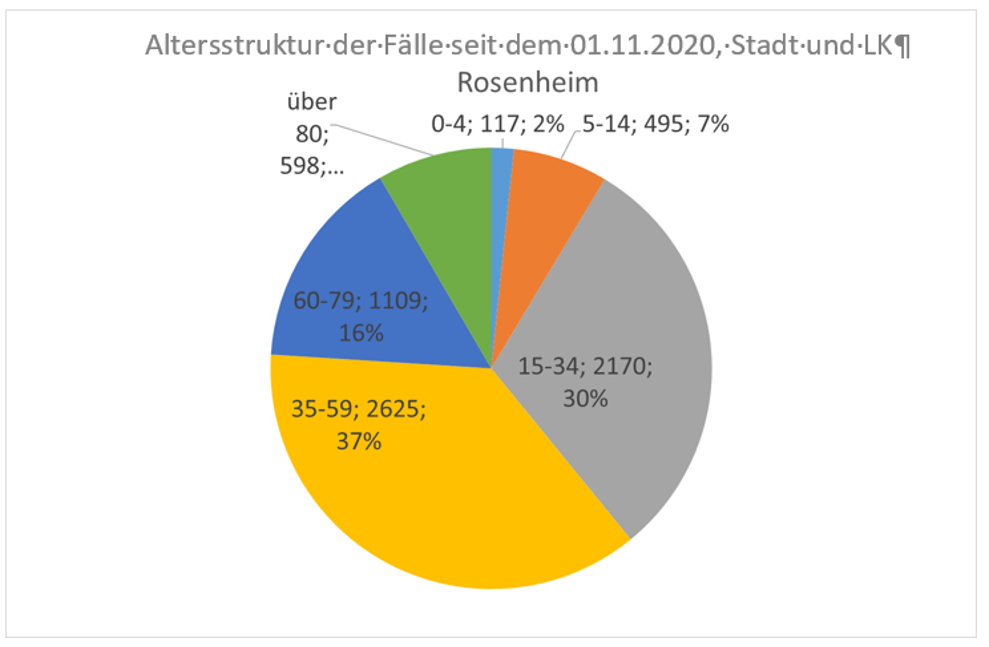 Seit dem letzten Wochenbericht mit Stand 07.01.2021 24 Uhr wurden dem Gesundheitsamt 570 neue Fälle für Stadt und Landkreis Rosenheim gemeldet. Bisher sind insgesamt 11973 Fälle von COVID-19 in Stadt und Landkreis Rosenheim aufgetreten (Landkreis: 9403, Stadt: 2570). Mittlerweile wurde bei mindestens 8946 Personen eine Genesung dokumentiert. 417 Personen (am 07.01.: 390) sind bis zu diesem Zeitpunkt an der Erkrankung gestorben (Landkreis: 371, Stadt: 46). Von den Verstorbenen waren 12 Personen unter 60 Jahren. 289 Verstorbene waren über oder gleich 80 Jahre alt. Dem Gesundheitsamt wurden 8 Personen gemeldet, die seit dem letzten Wochenbericht verstorben sind. Hiervon waren 6 Personen über oder gleich 80 Jahren und 1 Person zwischen 60 und 80 Jahren. 6 dieser Verstorbenen waren in einem Heim betreut worden.
