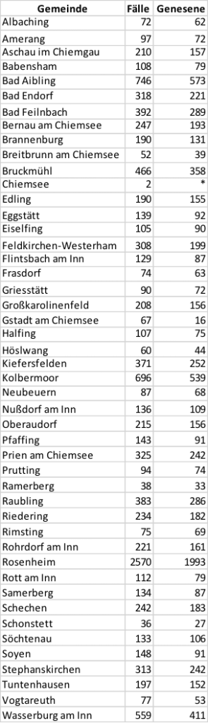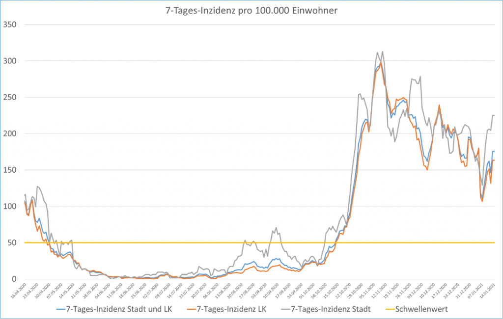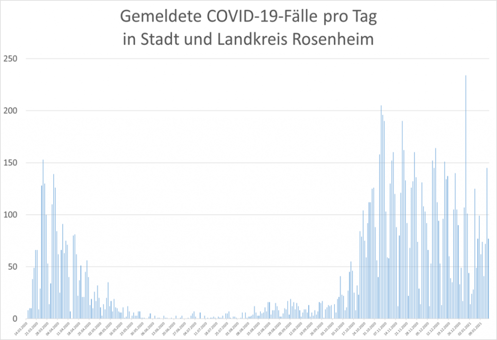 Die 7-Tage-Inzidenz (Fälle pro 100.000 Einwohner während der letzten 7 Tage) liegt mit Stand 15.01.2021 (0:00 Uhr) für die Stadt Rosenheim bei 225,02 (am 07.01.: 130,60), für den Landkreis Rosenheim bei 163,39 (am 07.01.: 106.76).