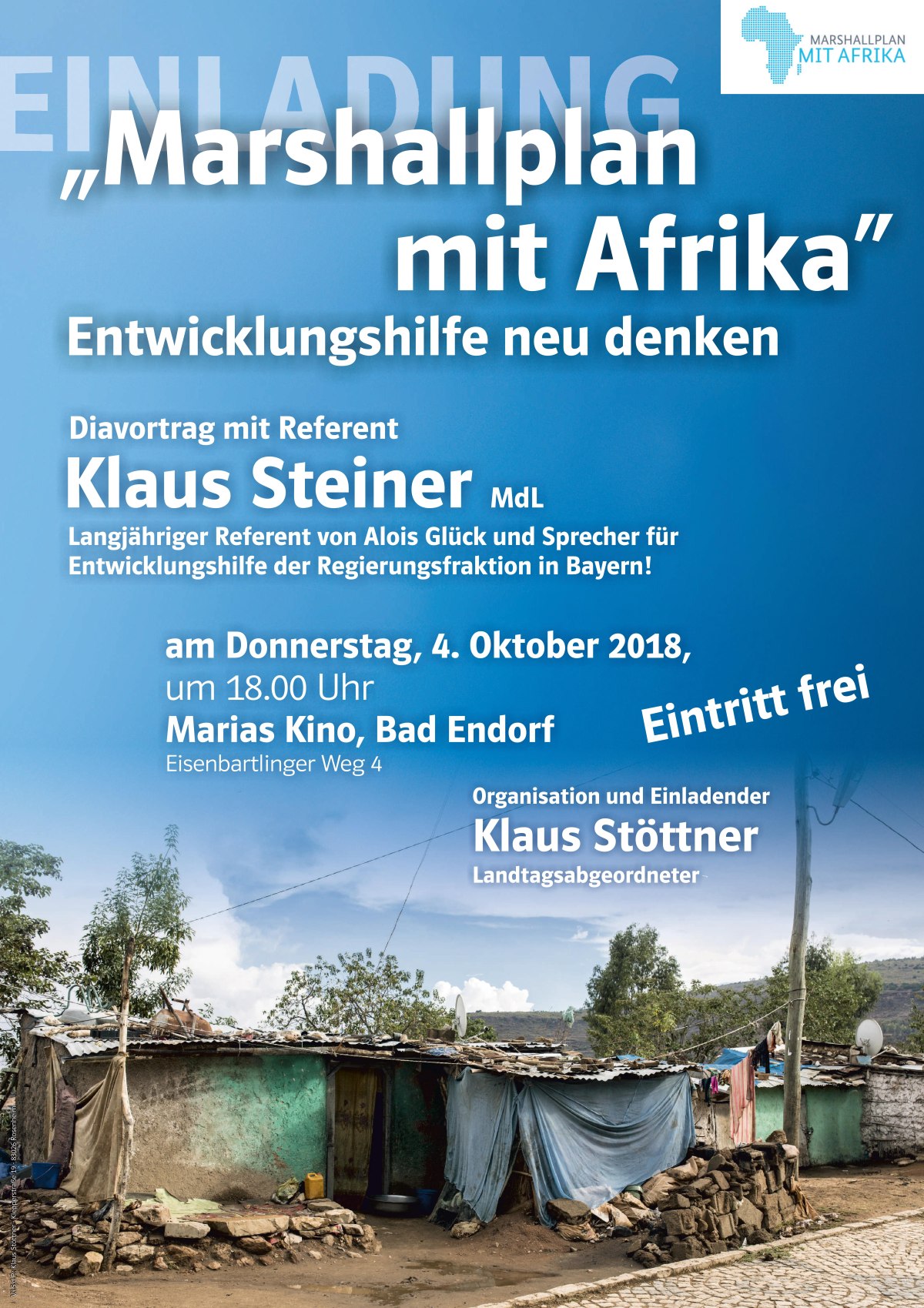 Zu einem informativen Fotovortrag lädt der Rosenheimer Landtagsabgeordnete Klaus Stöttner am kommenden Donnerstag, den 4. Oktober, um 18 Uhr in Marias Kino nach Bad Endorf ein. „Mit meinem Landtagskollegen, dem entwicklungspolitischen Sprecher der Landtagsfraktion, Klaus Steiner, konnte ich hierzu einen überaus interessanten Gastredner gewinnen, der viel von seinen Auslandsreisen nach Afrika berichten kann“, informiert der Abgeordnete über den Veranstaltungsabend. Besonders in aktuell bewegten Zeiten mit vielen offenen Fragen rund um die Flüchtlings- und Migrationspolitik sei es nach Ansicht von Stöttner wichtig, besonders auf die Fluchtursachenbekämpfung Wert zu legen: „Wir können mit jedem Euro in den Herkunftsländer viel mehr bewegen und den Menschen helfen als bei uns!“. Entscheidend sei deshalb für Klaus Stöttner dass mit einem „Marshall-Plan mit Afrika“ neue Lösungsansätze in der Entwicklungshilfe erarbeitet werden.