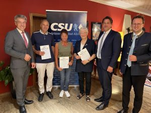 Geehrte für langjährige Mitgliedschaft und besondere Leistungen in der CSU Bad Aibling (v.l.): Landrat Otto Lederer, 30 Jahre Mitglied Dr. Alois Kreitmeier, 20 Jahre Mitglied Maria Eder, 50 Jahre Mitglied Marlene Liegl, Ortsvorsitzender Dr. Thomas Geppert, Erster Bürgermeister Stephan Schlier.