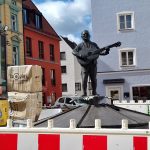 Die 94-jährige, geplegte Dame brummelt was von „schlecht Geh“ und „de Zähn“ durch die Maske und erzählt, dass ihr die im Heim angebotene Osterspeise nicht schmecke, weshalb sie in der Stadt „was G’scheits zum Mitnehma“ suche. Auch möcht sie schauen, wie die historische Altstadt jetzt vollends in ein Fußgängerparadies umgekrempelt wird. Baugerät umstellt das Stabdbild des legendären Roider Jackl. Hinter transparenter Wand an der Oberen Hauptstraße plätschert wieder das freigelegte Flüsschen Moosach durch die bald erneuerte Altstadt.