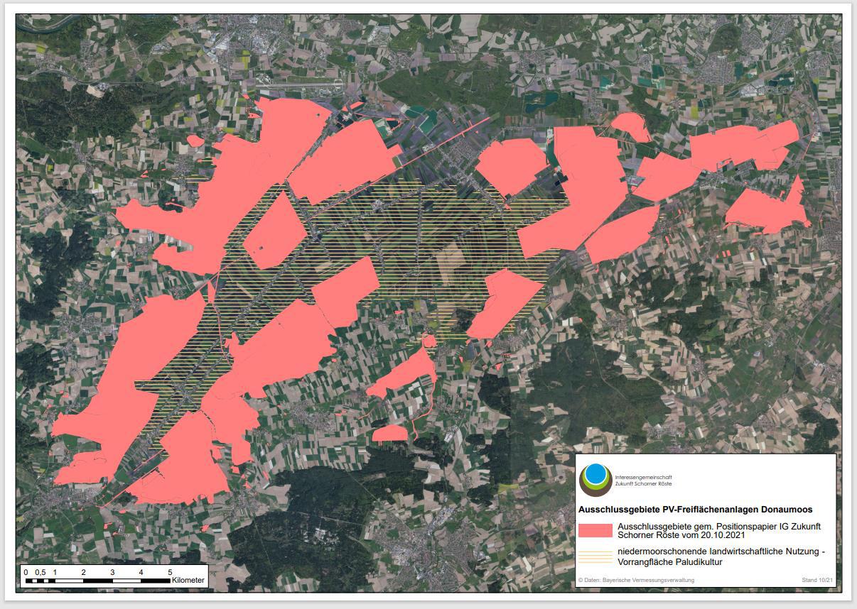 Schutzbereiche im Donaumoos, die für Freiflächen-Photovoltaikanlagen nicht geeignet – oder geeignet erscheinen; Karte zum Positionspapier der IG Zukunft Schorner Röste (Herbst 2021)