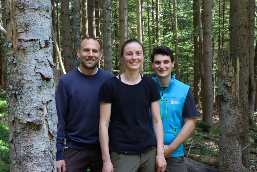 Geben spannende Einblicke in die Waldinventur im Schutzgebiet: Nationalparkmitarbeiter Jakob Ebenbeck (von rechts) und Isabelle Klein sowie Sebastian Dersch von der Uni Freiburg. (Foto: Nationalpark Bayerischer Wald)