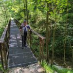 Bald erreichen wir die Wolfsschlucht. Ein Highlight ist der historische Salinensteg, ein eiserner Steg, der die Schlucht überspannt. Er war einst Teil der 2. Bayerischen Soleleitung, die Anfang des 19. Jahrhunderts errichtet wurde und bis 1958 in Betrieb war. Der Name “Wolfsschlucht” stammt übrigens von einer Felsformation oberhalb der Brücke, die an einen Wolfskopf erinnert – ein dramatischer Name, der der Schlucht etwas Mystisches verleiht.