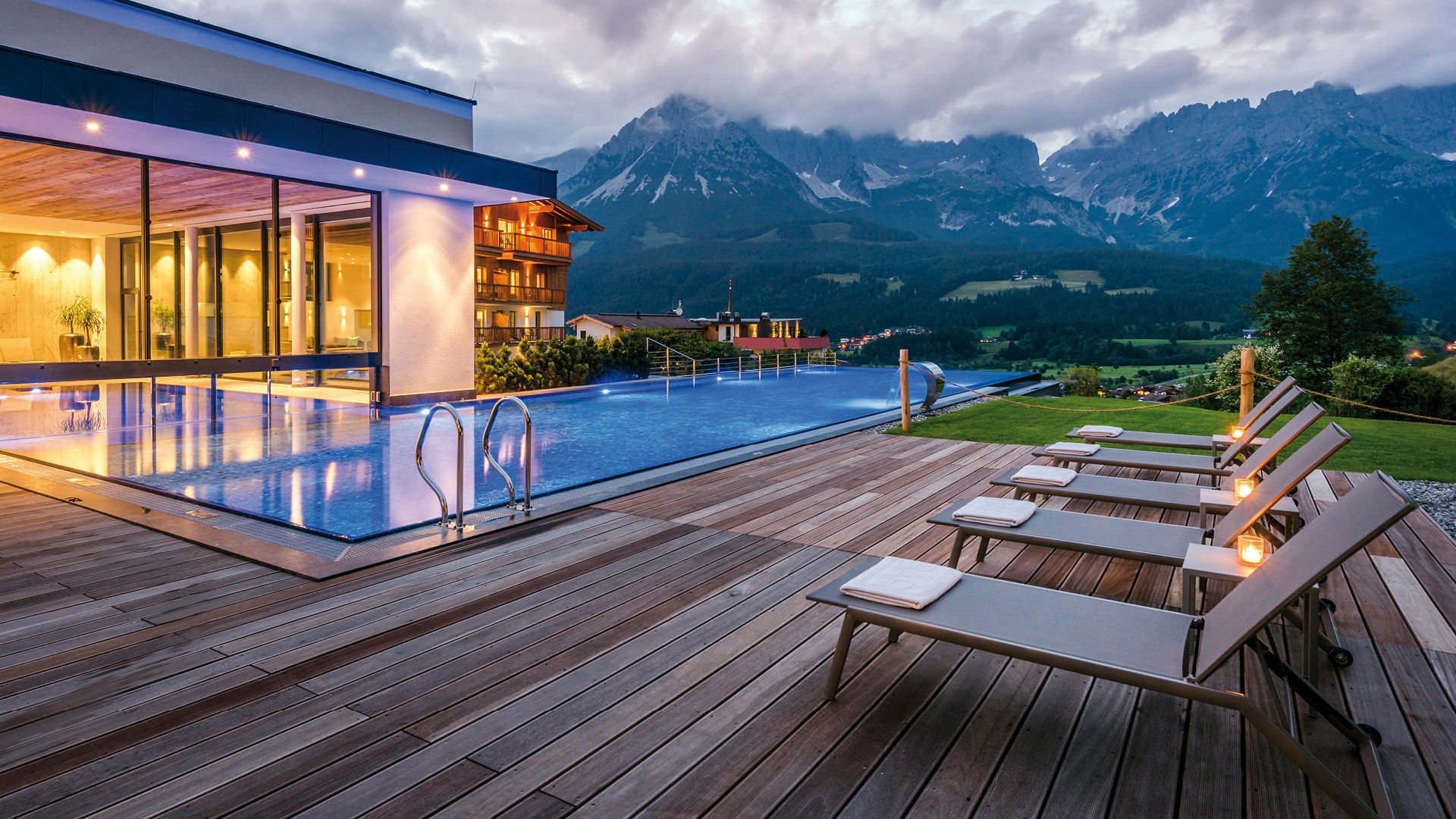 Der beheizte Infinity-Pool gewährt einen tollen Panoramablick auf die umliegenden Berge © Hotel DER BÄR / Günter Standl