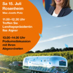 •Am Samstag, den 15.07.2023, kommt der Bayerische Landtag von 10 Uhr bis 16 Uhr mit dem LandTruck, einem umgebauten Oldtimer-Trailer, auf den Max-Josefs-Platz von Rosenheim. Neben Landtagpräsidentin Ilse Aigner (CSU) und Vizepräsident Markus Rinderspacher (SPD) werden auch die Abgeordneten Klaus Stöttner (CSU), Claudia Köhler (BÜNDNIS 90/DIE GRÜNEN), Nikolaus Kraus (FREIE WÄHLER), Andreas Winhart (AfD) und Martin Hagen (FDP) für Gespräche am LandTruck zur Verfügung stehen.
