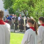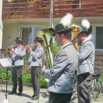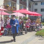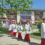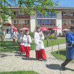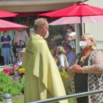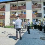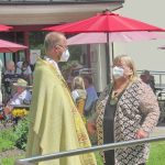 Erste Station war die Pfarrkirche „Mariä Himmelfahrt“, es folgte das Eichental und der Abschluss war beim Caritas-Altenheim St. Josef in Trautersdorf. Die musikalische Gestaltung in der Pfarrkirche übernahm Kirchenmusiker Bartholomäus Prankl mit einem kleinen Gesangs-Ensemble aus den Reihen des Kirchenchores. Die zweite Station im Eichental war von der Katholischen Jugend Prien (KJP) vorbereitet worden und ganz besonders auf Kinder und Familien zugeschnitten. Beim Altenheim hatte Schwester Juliane als Senioren-Seelsorgerin der Pfarrei mit ihrem Helferteam unter anderem dafür gesorgt, dass der Test-Containers Teil des Altars wurde.  Heimleiterin Theresia Meisl vom Altenheim St. Josef freute sich bei ihren Willkommensgrüßen sichtlich über das Zustandekommen des Gottesdienstes als sie sagte: „So einen schönen Tag haben wir sehnsüchtig erwartet, wir danken Allen, die sich auf den Weg zu uns gemacht und damit Freude zu unseren Heimbewohnerinnen und Heimbewohnern im Garten, auf den Balkonen und an den Fenstern gebracht haben“. Und Pfarrer Klaus Hofstetter ergänzte dies mit den Worten: „In den gewöhnlichen Fronleichnamsprozessionen mit den Stationen am Marktplatz, am Rathaus und am Gries kamen wir leider nicht am Altenheim vorbei, so möchte ich mich mit einem herzlichen `Vergelt´s Gott` bei der Heimleitung, beim Pflegepersonal und bei den Indischen Schwestern bedanken“. Ein weiterer Dank galt den Orts- und Kirchenvereinen mit ihren Fahnen und Abordnungen, der Priener Gebirgsschützenkompanie mit ihrem Ehrensalut unter der Leitung von Hauptmann Rudi Holthausen sowie der Priener Blaskapelle unter der Leitung von Dirigentin Regina Huber. Zu den Teilnehmern bei der Abschluss-Feier am Altenheim gehörten auch Dritter Bürgermeister Martin Aufenanger sowie Ehrenbürgerin Renate Hof und Ehrenbürger Michael Anner senior, bereits bei den ersten Stationen waren Erster und Zweiter Bürgermeister Andreas Friedrich und Michael Anner junior zugegen.