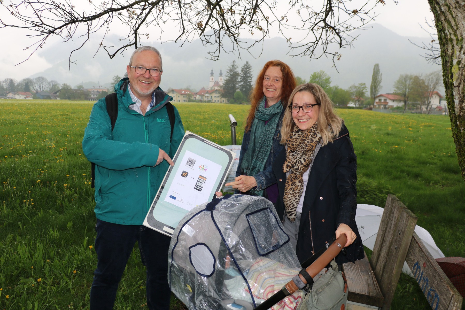 Peter Glaser, Regina Altendorfer und Regina Haas (von links) eröffneten gemeinsam mit Tobias – im Kinderwagen – den neuen Aschauer Familienweg südlich der Kinderklinik im KIZ Aschau; Stephanie Meier von der Jugendstelle Rosenheim konnte an der Eröffnung nicht teilnehmen.