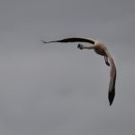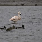 Leider kam dann ein Kajakfahrer in die Bucht (äußeren bis zu den Stecken) und hat alle Vögel erst einmal aufgescheucht. Den Singschwan habe ich noch beim Abflug fotografieren können. Danach haben sich der Singschwan und der Flamingo nur weit entfernt niedergelassen als der Kajakfahrer wieder weg war.
