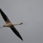 Der Flamingo hatte sich recht nah, südlich vom Steg, niedergelassen. Er flog so dicht vorbei, daß ich Mühe hatte ihn im Bild zu behalten ohne Teile von ihm abzuschneiden (mit 1200mm Brennweite ist das schwieriger als es auf dem Bild aussieht).
