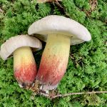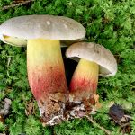 Der Schönfuß-Röhrling, wie er auf diesem Bild gleich zweifach zu sehen ist, gehört zur sogenannten Familie der Dickröhrling-Verwandten. Und wie man sieht, ist er wahrlich schön – aber er ist auch giftig, weshalb von einer Mitnahme oder gar einem Verzehr abzuraten ist.