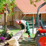 Das Irmengard-Hof-Team nutzt die Schließungszeit, um Gebäude und Außenanlagen auf Vordermann zu bringen. So wurden sämtliche Zimmer gründlichst gesäubert, die Böden frisch geölt, Blumen rund ums Haus gepflanzt und alle Wiesen gemäht. Hausmeister Klaus Pis hat aus einem Baumstamm eine schöne Bank angefertigt und sie vor dem Tiergehege aufgestellt. Künftig können sich hier Eltern im Schatten unter einem großen Baum niederlassen, um ihre Kinder bei der Stallarbeit oder beim Füttern der Tiere zu beobachten.