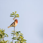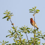 Der “Ruf” des Karmingimpel … oder vielmehr die ersten Sichtungen vor ein paar Wochen haben mich in das Grabenstätter Moos geführt. Auch wenn der “Ruf” klar und deutlich ist, so ist er selbst oft schwer zu entdecken. Stattdessen zeigte sich ein Teichrohrsänger und im Morgenlicht saßen drei Rotfußfalken nebeneinander auf der Stromleitung und in ein paar Meter Entfernung noch ein vierter. Schließlich positionierte sich der Karmingimpel dann doch noch schön im Sonnenlicht oben auf dem Buschwerk.