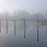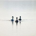 • Aus dem Nebel schwimmen drei Grazien in Richtung Bucht. Es sind drei Höckerschwäne, davon zwei Jungschwäne im ersten Jahr.