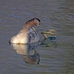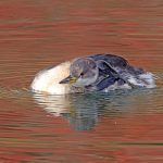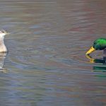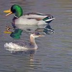 • Zuerst läst sich ein Rothalstaucher sehen. Lässig ist er unterwegs. Als er sich einem Stockenten Männchen im Prachtkleid nähert, wird die Situation von beiden beäugt. Als der Rothalstaucher die Stockente passiert, schnattert diese, vielleicht erleichtert? Zwischen Tauchgängen pflegt der Rothalstaucher sein Gefieder.