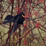 • Am Ufer pflück eine Amsel rote Beeren. Sie muss sich dazu artistisch anstrengen, um an diese zu kommen. Mit kräftigem schnellem Flügelschlag hält sie die Balance und schafft es, einige dieser Beeren zu erhaschen.