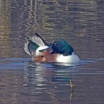 • Auf dieser Seite des Chiemsees halten sich im Winterhalbjahr auch immer viele Löffelenten auf. Noch ruhen die meisten von ihnen, aber ein Löffelenten Männchen im Prachtkleid putzt sein Gefieder. Scheint nicht so einfach zu sein mit dem breiten Löffelschnabel.
