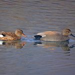 • Ein Schnatterenten Pärchen schwimmt ruhig vorbei.