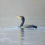 • Ein Kormoran kommt vom See in die Bucht eingeflogen, durch den Nebel ist er erst spät zu erkennen.
