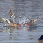 • Zwei Löffelenten, ein Weibchen mit einem Jungvogel, haben Stress. Vermutlich lässt sich der Jungvogel nicht mehr so viel sagen.