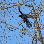 • Eine Rabenkrähe landet auf einem der am Ufer stehenden Bäume.