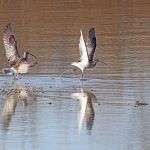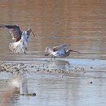 • Während ein oder zwei vor dem Turm auf Nahrungssuche sind, verstehen sich die beiden auf einer kleinen Sandbank stehenden Brachvögel nicht. Einer muß weichen und sucht das Weite.