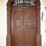 Die Tür ist in vier gleich große Felder unterteilt und jede Türfüllung ist mit dem gleichen Muster versehen. Eine Rosette in der Mitte und je eine Girlande darüber und darunter. Auch in den Sockel des hölzernen Türstocks ist auf beiden Seiten eine Rosette und eine zusätzliche Blume eingearbeitet. Darüber verläuft ein geschnitztes Zierband bis zum ebenfalls verzierten Türbogen. Die gläserne Oberlichte ist, wie bei den meisten Türen, mit Metallstangen geschützt.