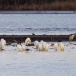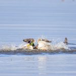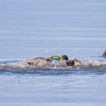 Im flachen Wasser hatten sich aber über 30 Silberreiher zum Schlafen versammelt. Ein vorbeifliegender Höckerschwan störte kurz und einige Köpfe wurden sichtbar. Als feststand, dass keine Gefahr drohte, verschwanden die Köpfe der Reiher wieder unter ihren Flügeln. Die kopflos scheinenden Reiher ruhten noch eine halbe Stunde, bis sie von der Morgensonne gewärmt zu ihren Tagesziel aufbrachen. Mehrere Stockentenerpel landeten vor dem Beobachtungsturm und warben eifrig schnatternd um die Enten. Zwei Erpel kämpften ausdauernd um das allerdings teilnahmslos wirkende Weibchen.