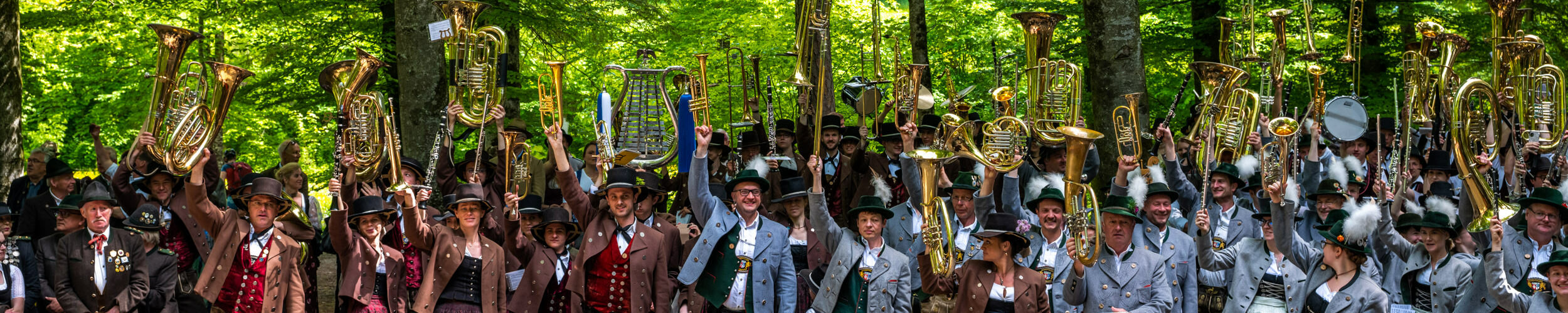 Die Musikanten aller 27 Kapellen zeigen den Musikantengruß zu Ehren des 160-jährigen Jubiläums der Musikkapelle Nußdorf