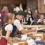 Natürlich war es auch für die jungen Trachtler ein aufregendes Ereignis – endlich mal die Räume des alten Schlosses sehen zu dürfen und sich ein Bild von unseren Schülern machen zu können. Diese gaben den kleinen Gästen gerne den Vortritt am abendlichen Buffet, das passend zum Anlass ganz bayerisch vorbereitet war. Die Kinder mischten sich selbstverständlich unter die Schüler im Speisesaal und genossen das außergewöhnliche Ambiente. Draußen wurde sogar auf unserem Streetball-Platz in neuer Freundschaft ein wenig gekickt. Ein gelungener Spätnachmittag, der schöner nicht hätte sein können und Schloss- wie Marktgemeinde wieder ein Stück näher zusammengeführt hat. Wir freuen uns auf ein Wiedersehen im Mai – wenn alles gutgeht – mit einer traditionellen Maibaum-Aufstellung.