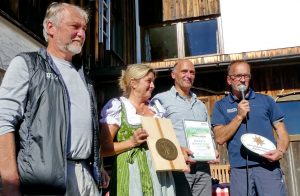 Vor drei Jahren: Verleihung des Umweltgütesiegels für die Priener Hütte, von links: Roland Stierle, ehemaliger Vorsitzender der DAV-Sektion Stuttgart, Hüttenwirtin Monika Becht, Priens Sektionsvorstand Josef Buchner und Hanspeter Mair von der DAV-Bundesgeschäftsstelle München.