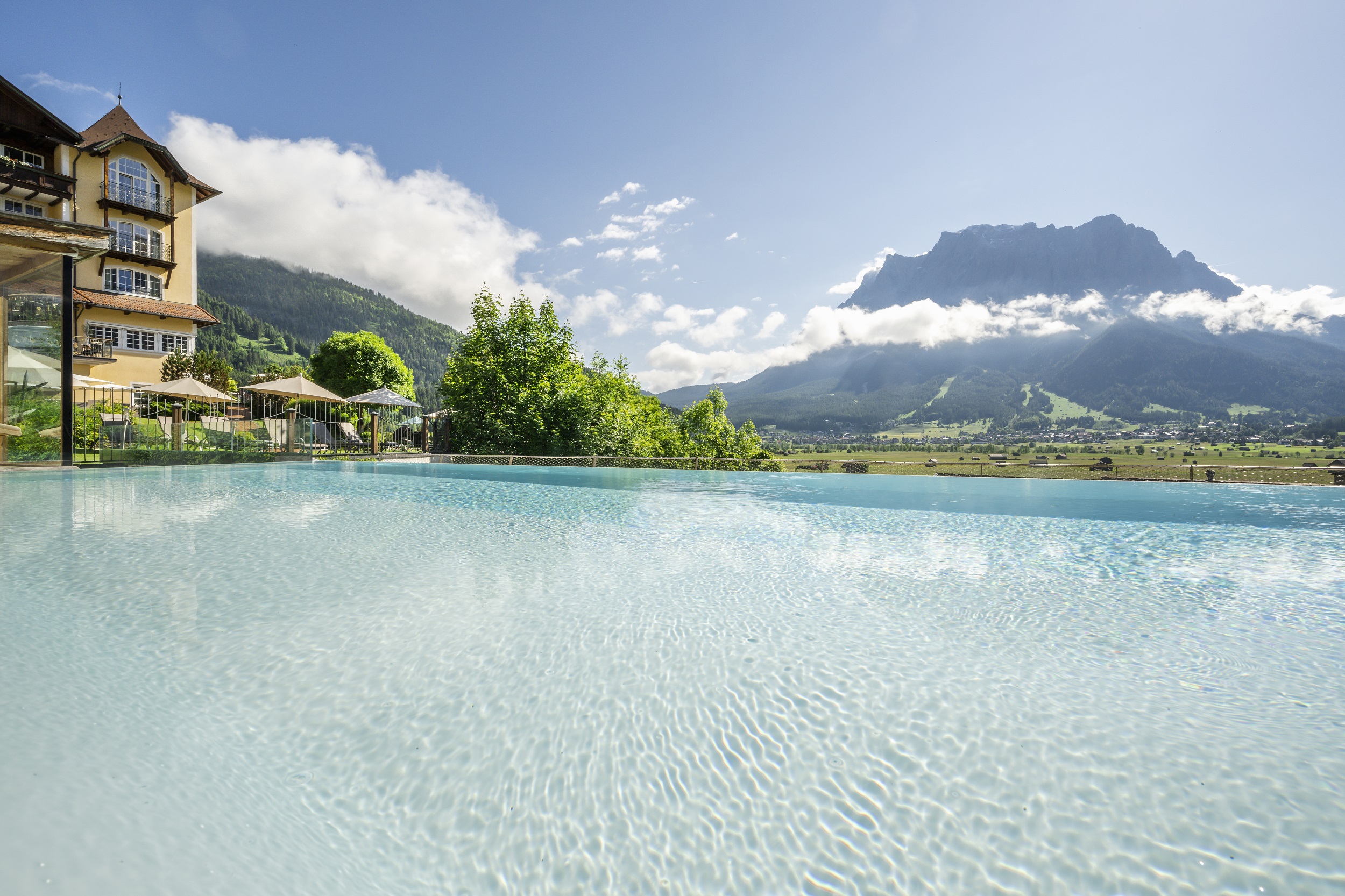 Das Hotel Post Lermoos bietet seinen Gästen einen 3.000m² großen Wellnessbereich und eine Sonnenterrasse mit freiem Blick auf die Zugspitze © Post Lermoos – Günter Standl