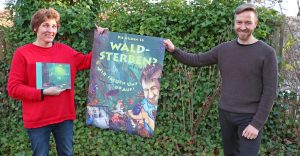 Die Schöpfer von „Die wilden 16“, Susanne Zuda und Thomas Michler, mit ihrem Werk samt dem dazugehörigen Plakat. Das wurde von einer Szene im Buch inspiriert, in der die Urwaldkäfer einen Bericht zum Waldsterben entdecken und das angehängte Bild gleich als ihre Heimat identifizieren. (Foto: Gregor Wolf/Nationalpark Bayerischer Wald)
