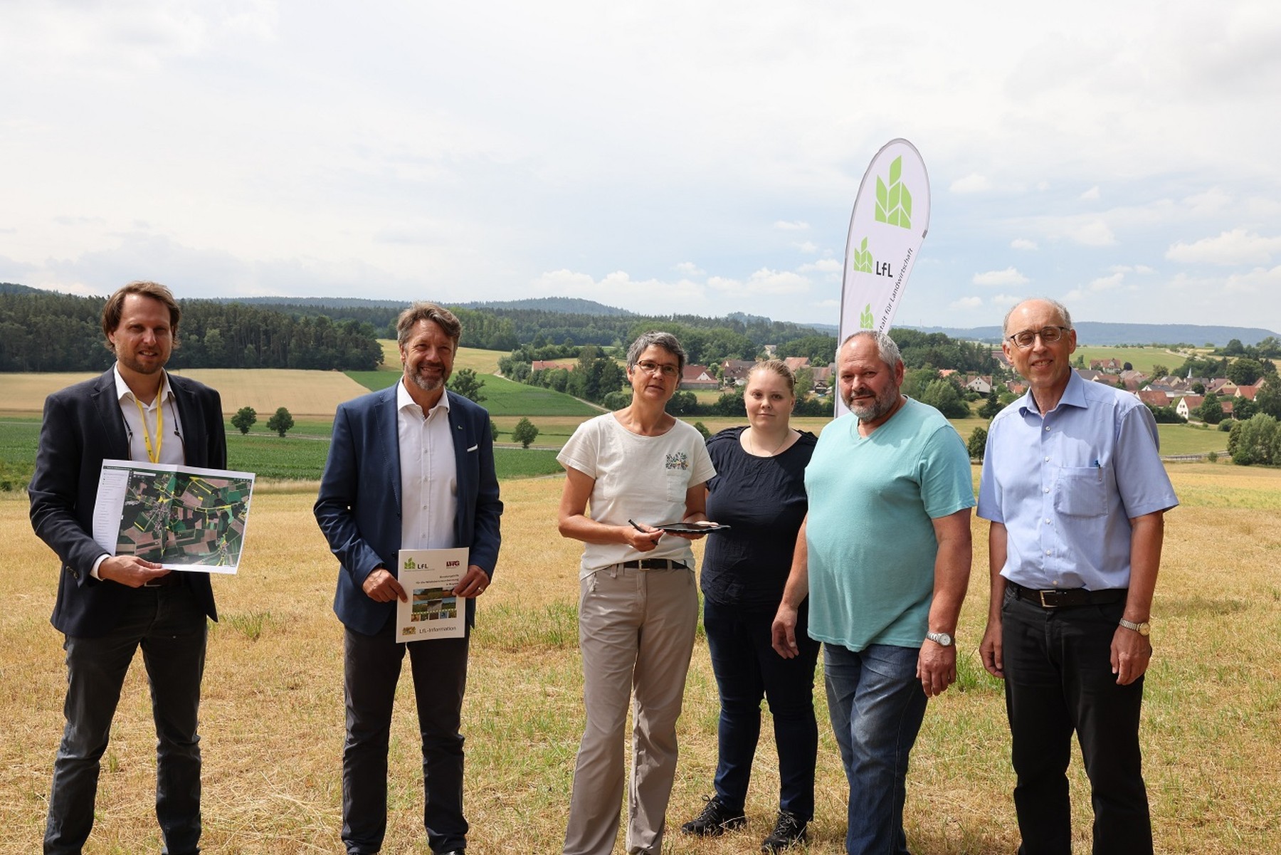 Philipp Bozem, Stephan Sedlmayer, Elisabeth Remlein, Ruth und Gerhard Moßner, Hans Walter bei der Vorstellung der neuen LfL-App. (B. Gleixner / LfL)
