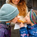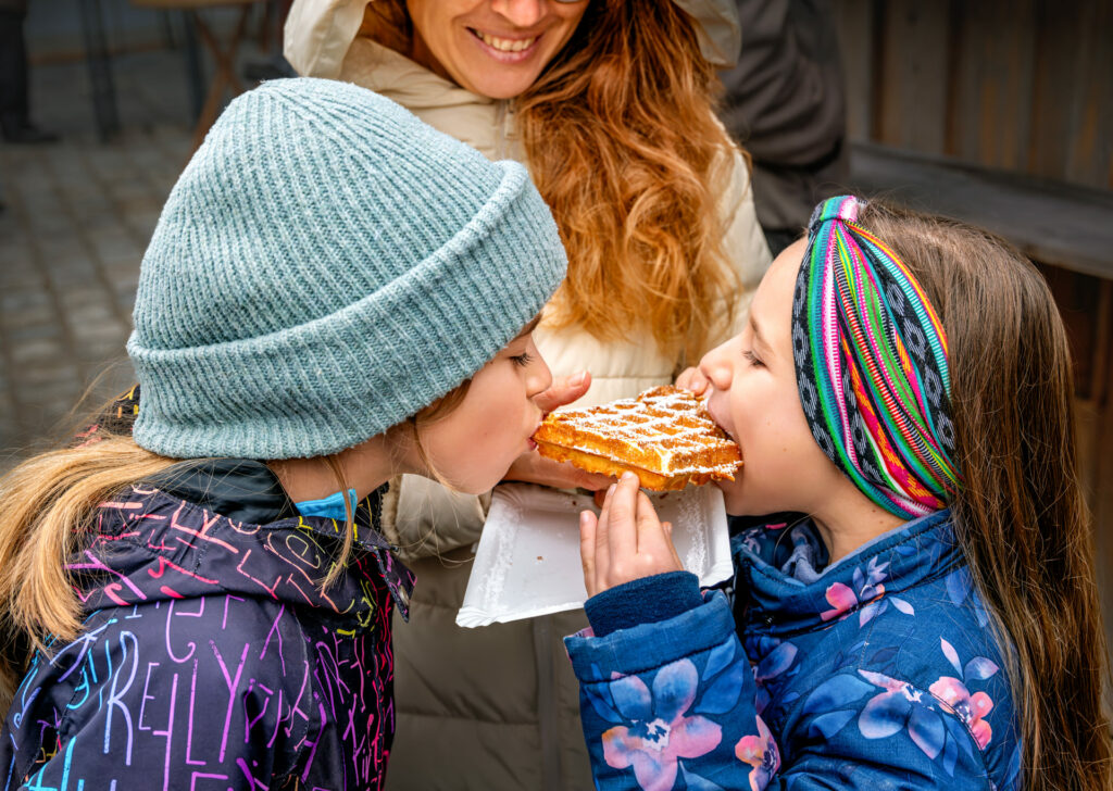 Mit leuchtenden Augen teilen sich die zwei Geschwister Felicitas und Miriam eine frisch gebackene Waffel – ein kleiner, warmer Glücksmoment mitten im winterlichen Treiben des Samerberger Dorfadvents. Puderzucker auf den Lippen, Vorfreude im Gesicht: So schmeckt Advent.