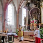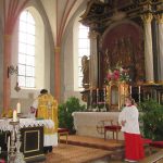 Dreifalltigkeit, das Patrozinium der Kirche von Altenbeuern, musste heuer in kleiner Form gefeiert werden. Anmeldung zum Gottesdienst war nötig, die Zahl der Kirchgänger ist deshalb begrenzt. Pfarrer Christoph Rudolph und die Messdiener mit Mundschutz und auch das Wetter war nicht Feiertag tauglich-kein schöner Festtag – doch: “werd wieder anders wern”- so auch bei der letzten Maiandacht des Jahres, die traditionell von der KAB-Gruppe gestaltet wurde. Eigentlich immer am Feldkreuz beim Pfarrheim mit Musik und abschließendem Eis-Essen für alle. Heuer nun musste die Andacht in die Pfarrkirche verlegt werden.