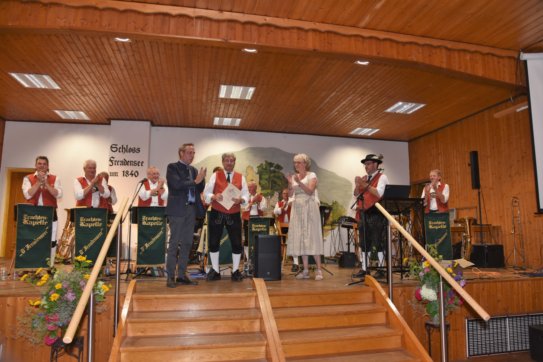 Stehender Applaus für Kapellmeister Rudi Pangerl: Er steht nicht nur seit mehr als 55 Jahren an der Spitze der Trachtenkapelle, sondern ist auch das letzte aktive Gründungsmitglied.