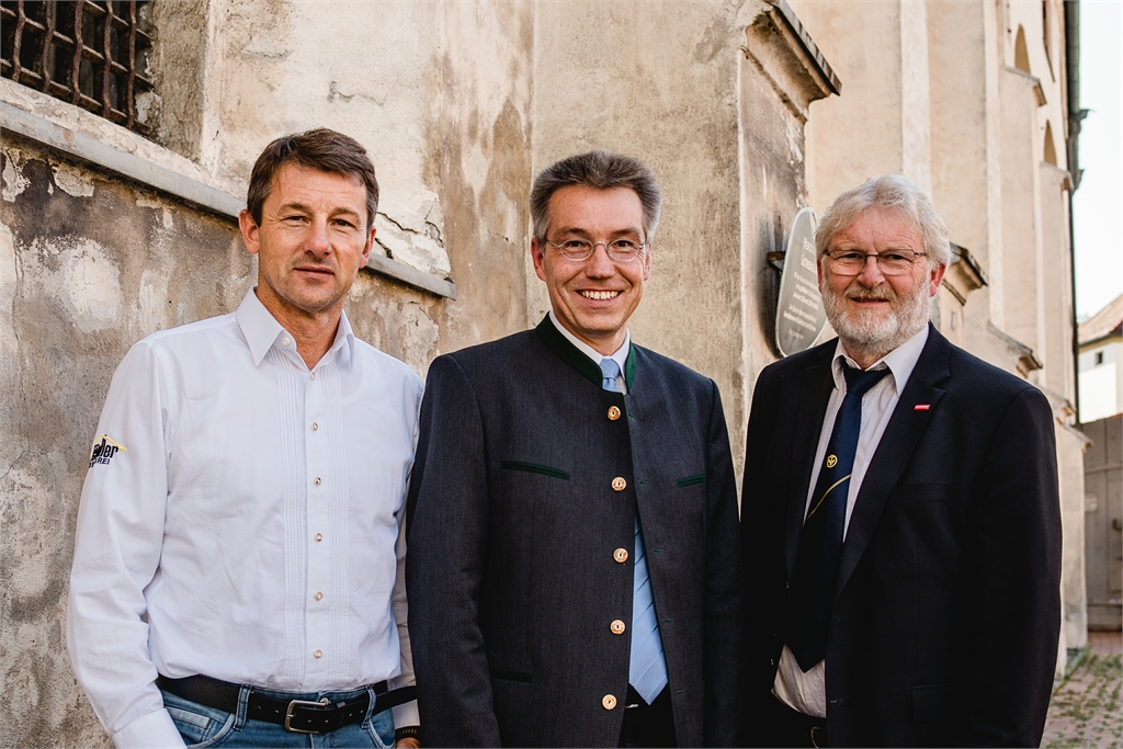 Der CSU-Landtagsabgeordnete Otto Lederer (Mitte) bei der Überbringung der freudigen Nachricht an die Kreishandwerkerschaft Rosenheim, stellvertretend Kreishandwerksmeister Gerhard Schloots (rechts) und Rudi Schiller (links), Technischer Leiter der Burg Wasserburg. – Foto: Andrea Mittermeier