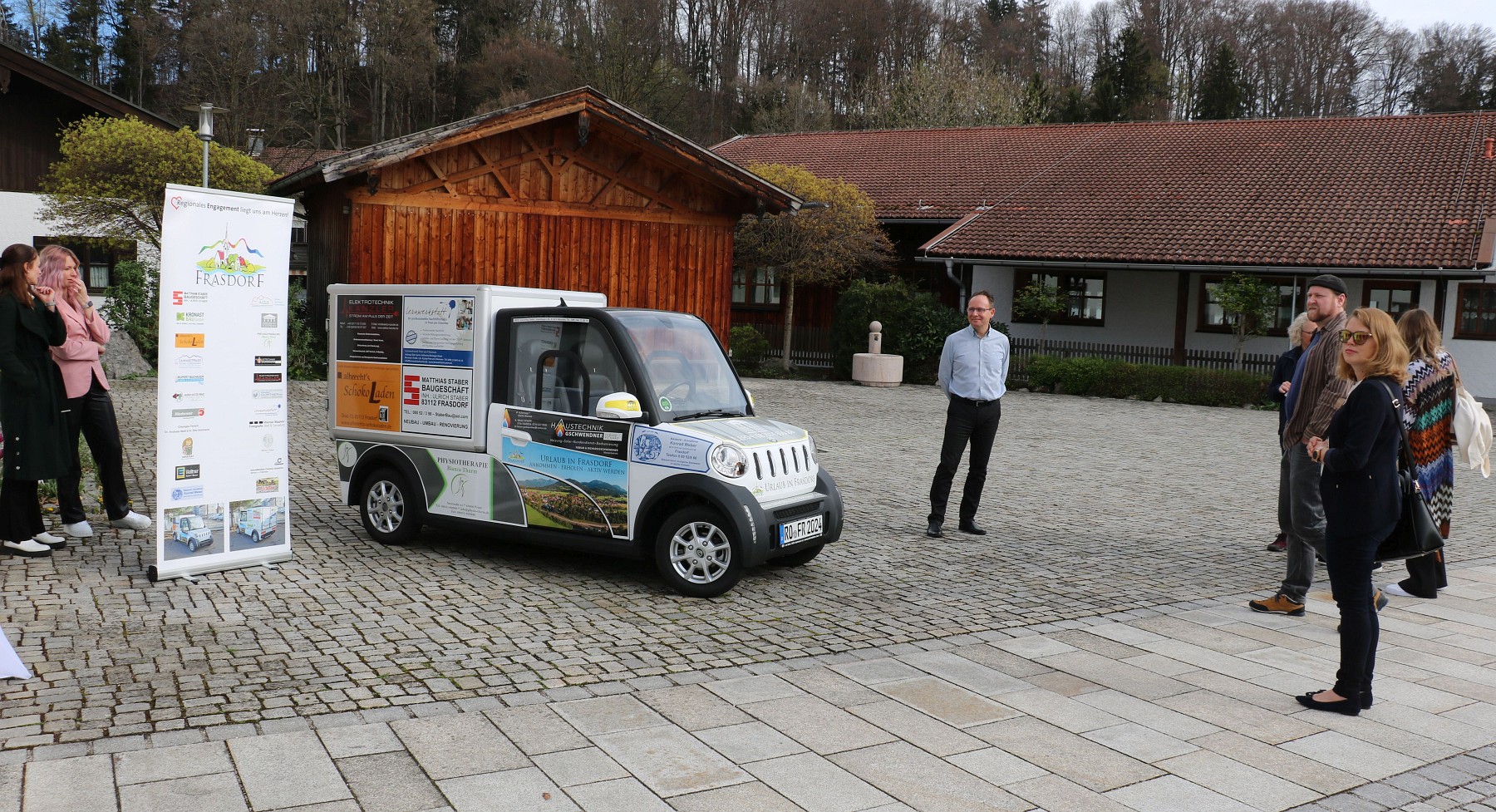 Bürgermeister Daniel Mair (rechts) und die Förderer und Sponsoren des ersten gemeindlichen Elektrofahrzeugs vom Typ ARI 458 der Gemeinde Frasdorf.