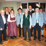 happing_ehrungen: Ehrungen für langjährige Vereinstreue (von links): Walter Wünsch (60 Jahre), Peter Bodner (75 Jahre), zweite Vorsitzende Manuela Hehensteiger, Maria Mayer (70 Jahre), Ehrenmitglied Josef Dräxl (60 Jahre), Josef Lochner (60 Jahre), Pfarrvikar Mathias Klein-Heßling, Ehrenmitglied Josef Gilg (60 Jahre), zweiter Gauvorstand Markus Kronberger und Vorstand Franz Haigermoser. Nicht auf dem Fotos sind Franz Schmid und Rupert Weingast (jeweils 60 Jahre).