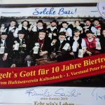 Seit nunmehr zehn Jahren ist das Hofbräuhaus Traunstein Getränke-Lieferant für die Vereinshütte und bei Turnier- und Festzelt-Veranstaltungen des Hufeisenvereins Prien-Kaltenbach. Für diese Kundentreue bedankte sich Verkaufsleiter Rudi Lutz vom Hofbräuhaus Traunstein bei Ersten Vorstand Peter Freund mit einer Ehrentafel, die nunmehr in der Vereinshütte