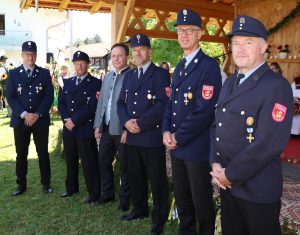 Georg Maurer, Georg Furtner, Georg Noichl und Hans Schäffer erhielten das goldene Feuerwehrehrenzeichen des Freistaats Bayern für 40 Jahre aktiven Feuerwehrdienst aus der Hand von Bürgermeister Daniel Mair (vierter von rechts) und Kommandant Martin Dialler (links)