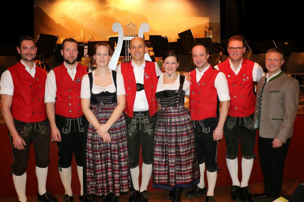 Musik verbindet und hält jung: seit 40 Jahren sitzt Franz Pertl am Schlagzeug und an den Perkussionsinstrumenten der Musikkapelle Aschau und sorgt stets für den richtigen Takt. Der Verbandjugendleiter im Inn-Chiemgau des Musikbundes Ober- und Niederbayern Benedikt Paul überreichte dem Jubilar beim Jahreskonzert in der Aschauer Festhalle das goldene Ehrenzeichen des Musikbundes. Die Urkunde und das Silberne Abzeichen für 25-jährige aktive Mitarbeit erhielten Maximilian Schelzke (Tenorhorn), Agnes Staber (Waldhorn), Marie-Luise Peschek (Querflöte), Christian Pertl (Trompete), Andreas Hamberger (Trompete) und der Vorsitzende der Musikkapelle Aschau Simon Pertl (Bass).