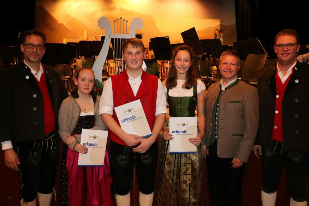 Franziska Hamberger, Magdalena Thaller und Thomas Pertl erhielten von Benedikt Paul, das Leistungsabzeichen des Musikbundes Ober- und Niederbayern in Bronze. „Die Leistungen, die für dieses Abzeichen erbracht werden müssen, sind groß. Alle miteinander haben sich sehr gut auf die Theorieprüfung, die sehr umfangreich und fordernd war, vorbereitet. Auch die Praxis haben sie auf ihren Instrumenten gut gemeistert“, so Benedikt Paul bei der Preisverleihung. Über 200 junge Musikanten beteiligten sich im ganzen Bezirk an dieser Prüfung.