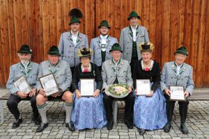 Ehrungen für 60-jährige Mitgliedschaft beim Trachtenverein Frasdorf. Von links: Hans Huber, Leopold Baumgartner, Irmgard Widholzer Sebastian Bauer (75 Jahre) Anni Brunner, Altbürgermeister Benno Voggenauer senior, dahinter zweite Reihe stehend der Vorsitzende des Trachtenvereins „D´ Lamstoana“ Frasdorf Sebastian Graf (Mitte) und seine beiden Stellvertreter Georg Wörndl (rechts) und Andreas Kink (links)