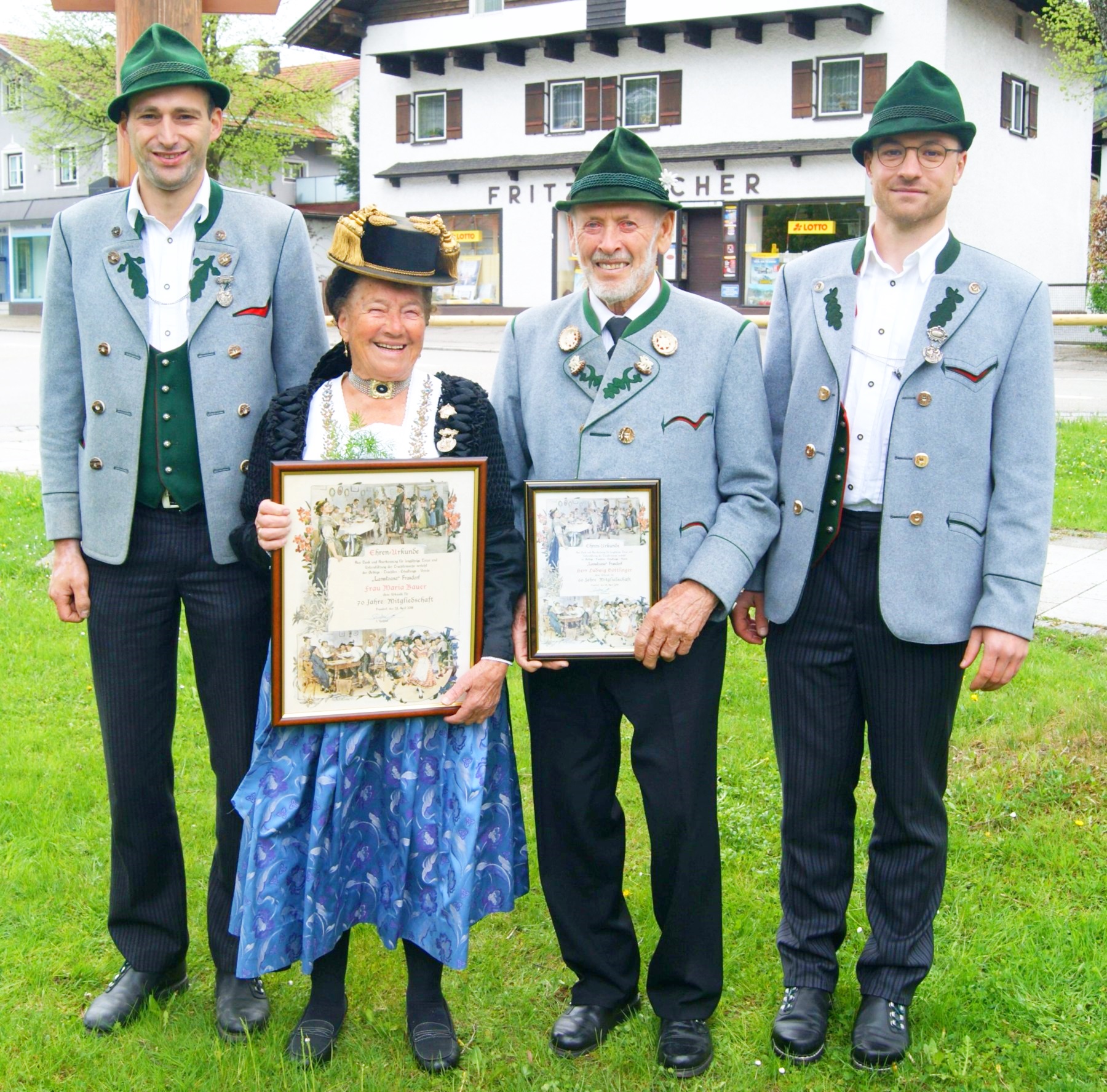 Die beiden stellvertretenden Vorsitzenden des Trachtenvereins „D´ Lamstoana“ Frasdorf Georg Wörndl (links) und Andreas Kink überreichten die Ehrenurkunde für 70 Jahre aktive Vereinsmitarbeit an Maria Bauer, Ludwig Göttlinger erhielt die Urkunde für 60 Jahre.