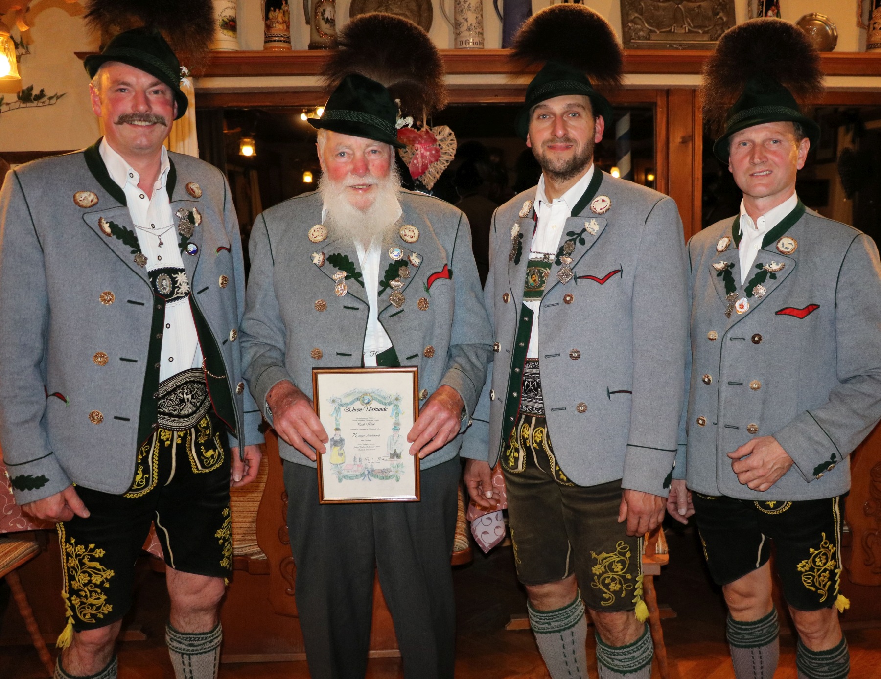 Seit 70 Jahren ist der Ehrenvorstand des GTEV Edelweiß Niederaschau Paul Kink senior (zweiter von links) Mitglied im Trachtenverein zusammen mit den drei Vorständen Paul Kink junior, Peter Reiter und Sepp Thaurer.
