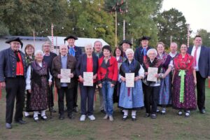 Das Foto zeigt von links: Walter Bräutigam, Gauvorsitzende Inge Burkhard-Vatterodt, Martha Hofmann, Albrecht Hofmann, Karl Brembs, Bereichsleiter Vereinsleben Florian Kress, Christa Brembs, Herbert und Margit Knaup, Renate und 1. Vorstand Albert Hein, Gabriele Hümmer, Bereichsleiter Liegenschaften Dominik Wegner, Anneliese Schlembach, Bereichsleiterin Schriftführung Katharina Kaiser, Josef Rückert, Bereichsleiterin Kassenwesen Theresa Bähr und Bürgermeister Peter Gehring.